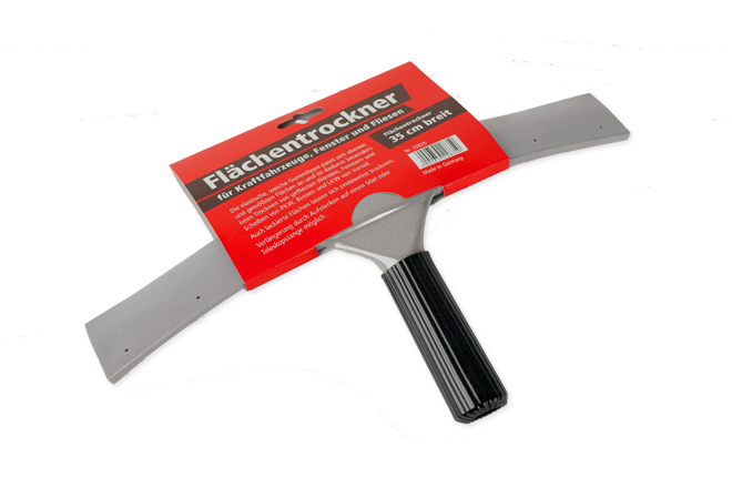 Flächentrockner mit elastischer, weicher Gummilippe in Farbe helgrau, der sich ebenen und gewölbten Flächen anpasst. Metallgriff mit Überzug (Verlängerungsmöglichkeit durch Stiel oder Teleskopstange), Aufhänger und FEBU EAN-Code.